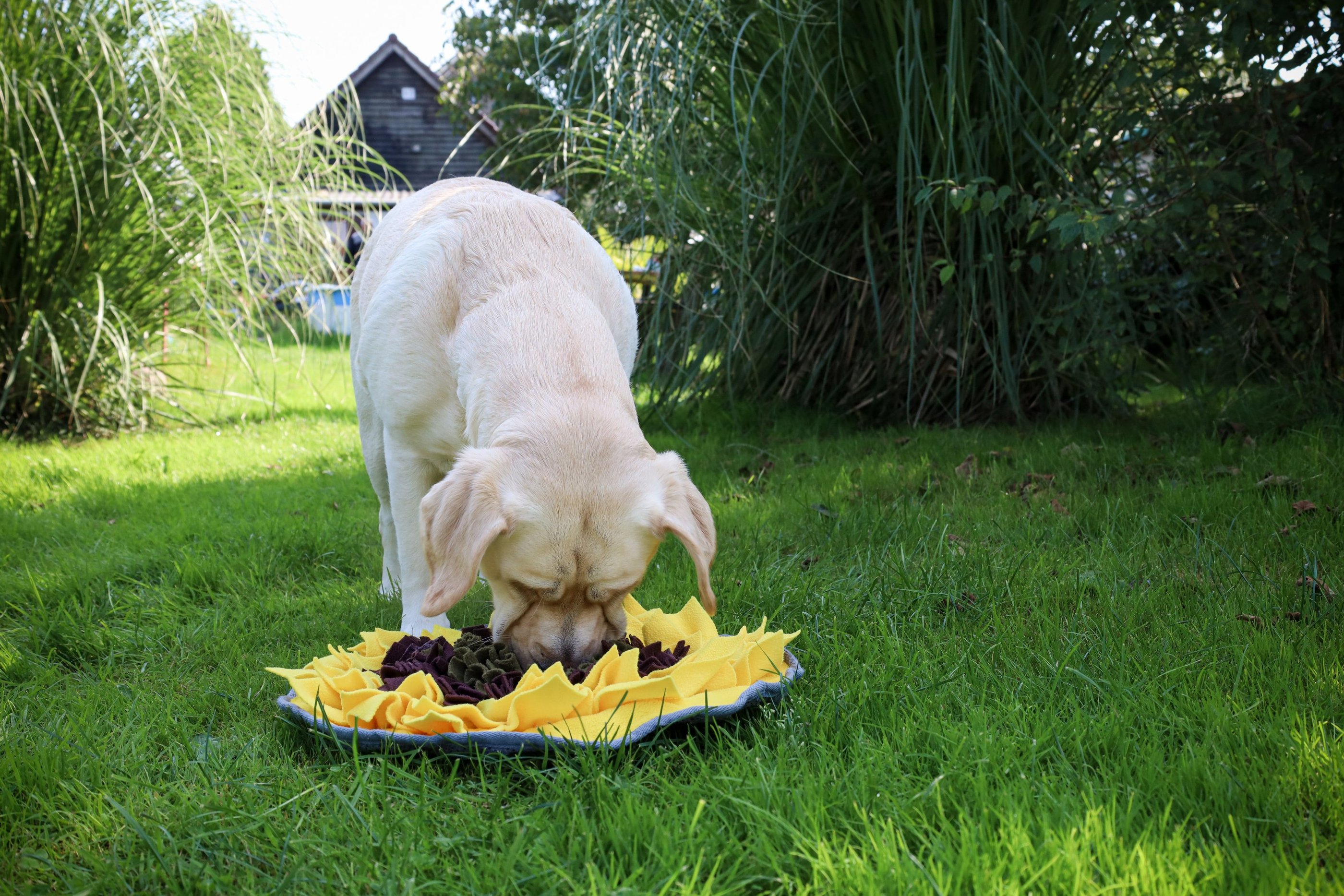 Zo kan verrijking in zetten tijdens het eetmoment van je hond. Met bijvoorbeeld een slowfeeder, voerspeeltje of snuffelmat. Je hond zal niet alleen rustiger gaan eten, maar ook meer nadenken over hoe hij bij het eten kan komen. Minder snel het eten opeten kan een fijne invloed hebben op de spijsvertering.